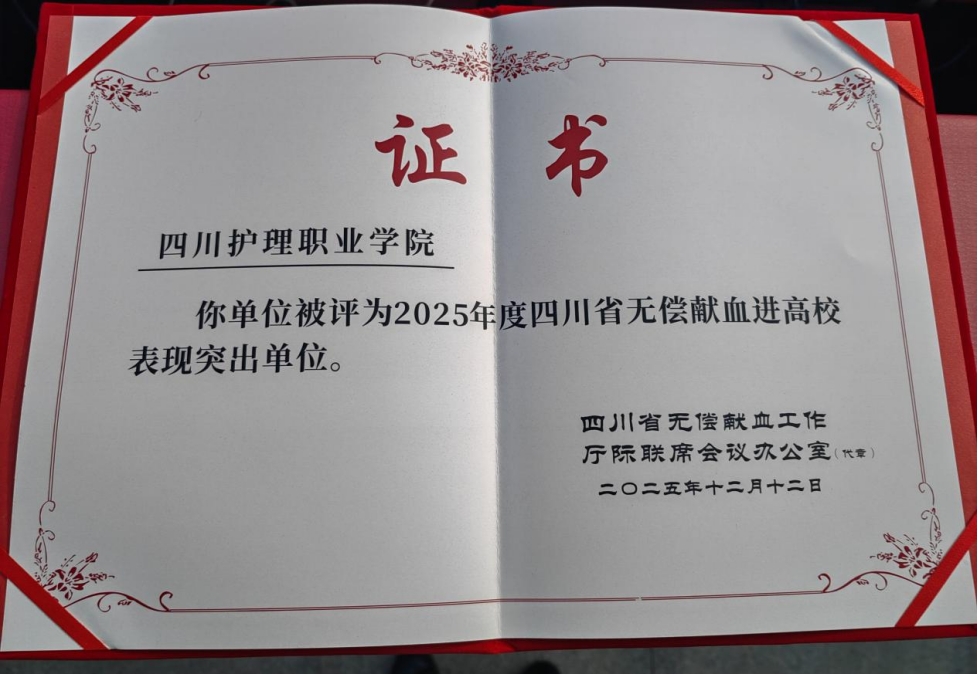 活动上,学院凭借在无偿献血公益事业中的扎实举措与显著成效,被授予“2025年度四川省无偿献血进高校表现突出单位”荣誉称号,彰显了卫生健康类院校的责任与担当。